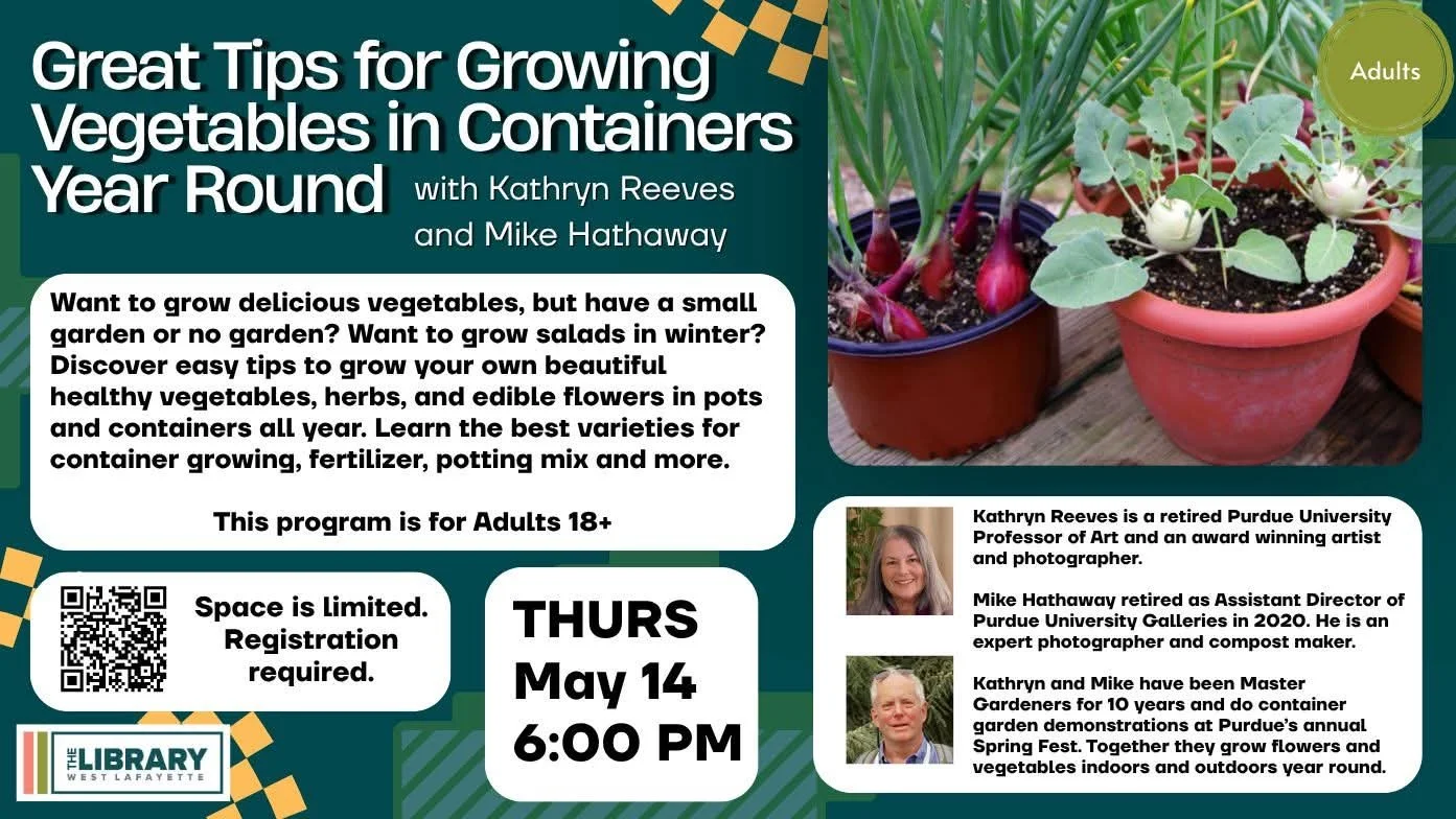 Kathryn Reeves is a retired Purdue University Professor of Art and an award winning artist and photographer. She also taught in the College of Design at Iowa State University and worked as a garden designer with a landscape architect. Mike Hathaway retired as Assistant Director of Purdue University Galleries in 2020. He is an expert photographer and compost maker. Kathryn and Mike have been Master Gardeners for 10 years and do container garden demonstrations at Purdue’s annual Spring Fest. Together they grow flowers and vegetables indoors and outdoors year round.