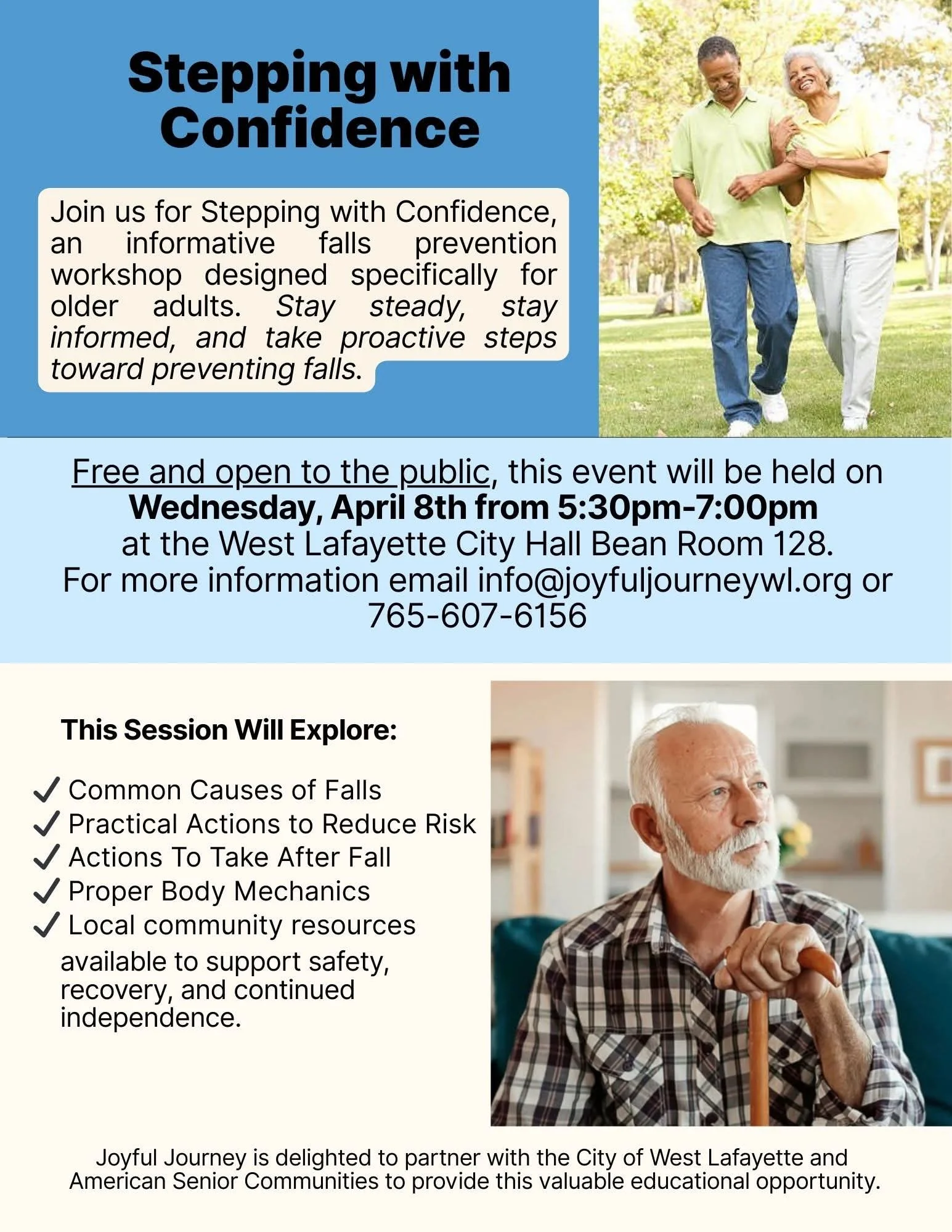 Joyful Journey is delighted to partner with the City of West Lafayette and American Senior Communities to provide this valuable educational opportunity.